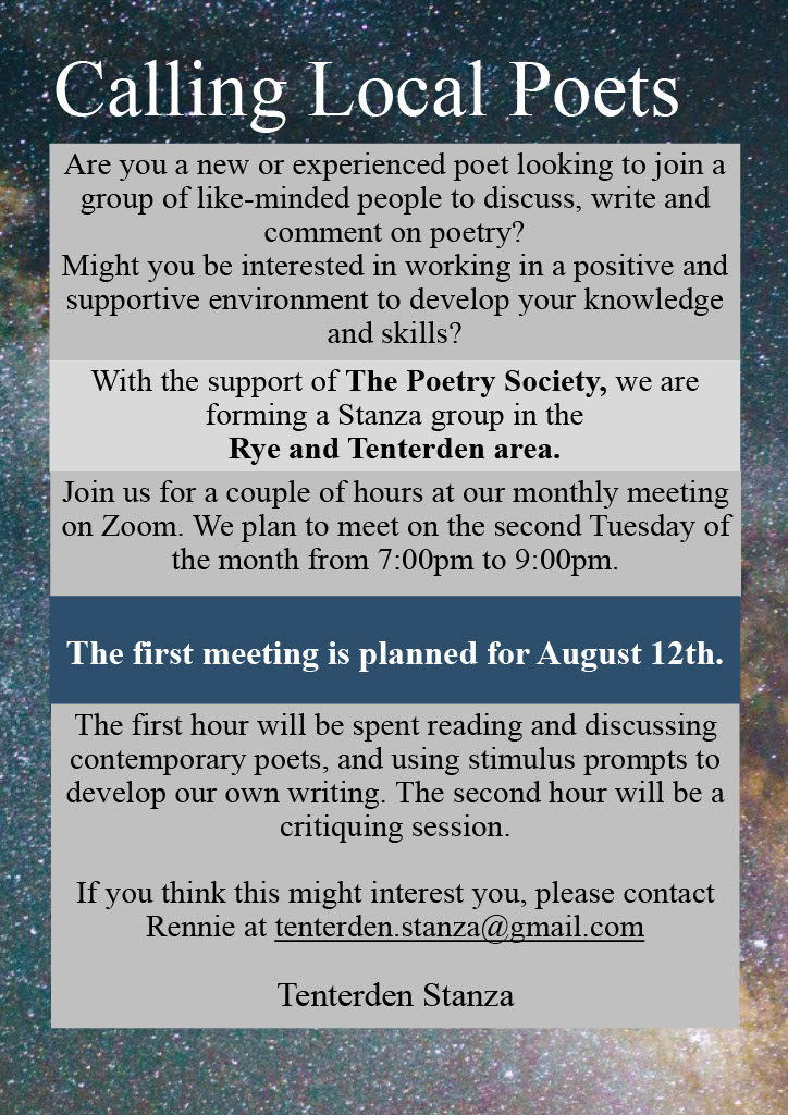 One outcome of the residency was a request for more creative writing opportunities locally. In response I’m starting a new Tenterden and Rye Stanza group, with the blessing of the Poetry Society.